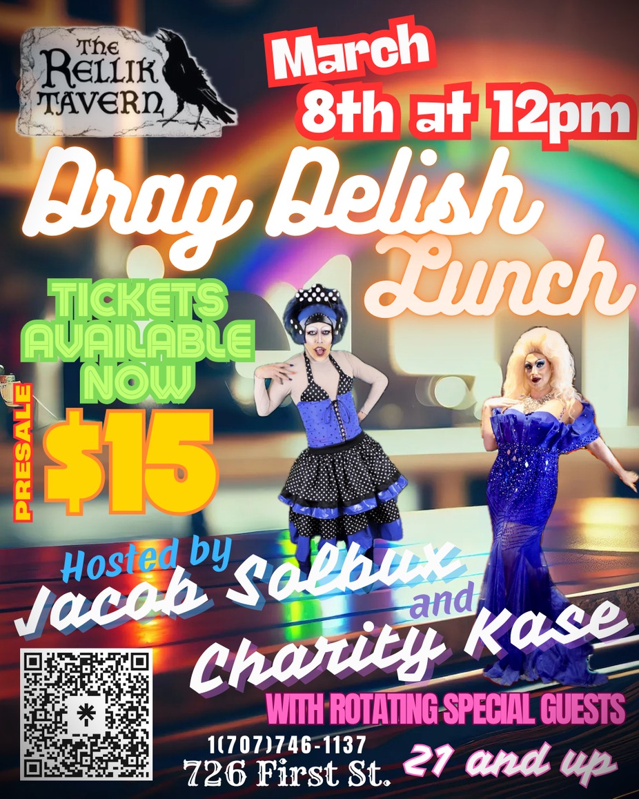 We're back again at Rellik Tavern in Benicia for our next Drag Lunch. Come show your lovely face and contribute to the vibes. Together, we can have some fun and enjoy queer/art entertainment. Maybe you're familiar with drag or just curious about drag shows, this event will be what you never knew you were looking for... Get your folks, come hungry for good food, drag themed drink specials and the best bloody marys in #Solano County. Let the rainbow magic unfold! Buy your presale now for only $15 below. https://www.eventbrite.com/e/rellik-drag-delish-lunch-tickets-1982029719245?aff=oddtdtcreator we'll also be giving away prizes and doing raffles for a big grand #prize Hosted by @charitykase925 @jacob_solbux with rotating special guests.