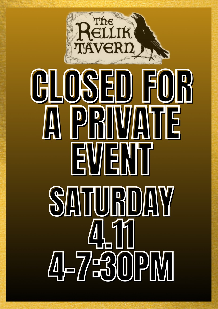 SATURDAY 4/11- 4-7:30PM- CLOSED FOR A PRIVATE EVENT